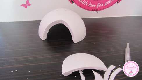 Für die Schatzhöhle habe ich die Hälfte einer Styroporkugel Ø 20cm (diese gibt es in Bastelgeschäften) verwendet, dazu den überstehenden Rand entfernen und einen Eingang herausschneiden.