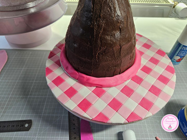Eine Barbie-Torte benötigt immer ein Cakeboard, ich habe mich in diesem Fall mit den Farben und Mustern am Film orientiert und deshalb die Karos verwendet. Für einen schönen Glanz habe ich das fertige Cakeboard dann noch mit Lebensmittellack angesprüht.