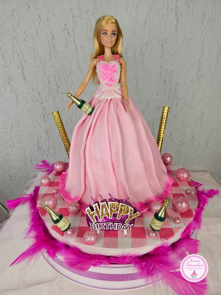 Mit Fondant oder Buttercreme könnt ihr ein prachtvolles Kleid zaubern, welches die Puppe trägt. Pinke und Glitzernde Dekorationen, rosa Kugeln, essbaren Glitzer, Eisfontänen und ähnliches, diese Details verleihen der Torte den glamourösen Touch, den man von Barbie erwartet.