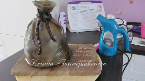 Damit er auch standesgemäß und feierlich in den Club der alten Säcke aufgenommen werden konnte, habe ich ihm diese ''Sacktorte'' gezaubert. Um ihm diesen schweren Schritt etwas zu erleichtern, habe ich die Torte dann noch mit Goldtalern gefüllt.