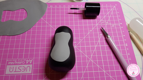 Zuerst habe ich den Körper aus ca. 120 g geformt, einfach auf den Ausdruck legen und der Form des Maulwurfes anpassen. Für den Latz habe ich dann ca. 20 g graue Modellierpaste ausgerollt, das Bild darübergelegt und den Latz auf dem Bild nachgezeichnet, dann brauchte ich ihn nur noch mit einem Skalpell ausschneiden.