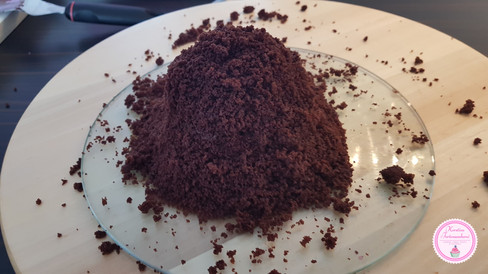 Für den Maulwurfhügel habe ich den Kuchen aus der Halbkugel mit Ganache eingestrichen und Kuchenkrümel in die noch weiche Ganache gedrückt. Die Kuchenkrümel bleiben beim Füllen der Torte übrig.