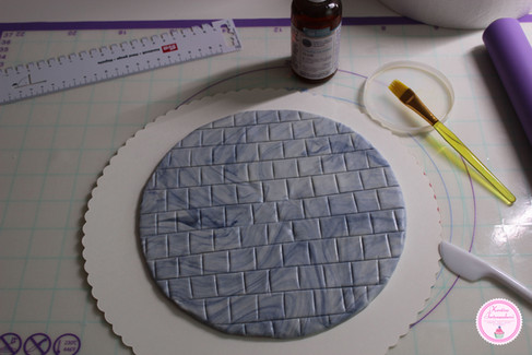Mithilfe eines Lineals und einem Zahnstocher habe ich mir die Fliesen markiert und eingeprägt. Vorsichtig arbeiten! Auf dem weichen Fondant bekommt man schnell Abdrücke von Fingern und Werkzeugen. Im Anschluss habe ich die Oberfläche noch mit essbarem Lack versiegelt.